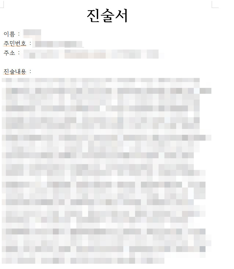 일단 글 자체는 하나의 디자인입니다. 디자인이 무의식으로 심어주는 그 느낌은 사실 어마무시하죠. 귀여운 손글씨체의 폰트보다는 고딕이나 명조체,바탕체를 사용하는 것이 더 정중해보입니다. 본문은 11~12pt로 가독성 좋은 폰트와 크기를 토대로 글을 작성하는 것이 좋다고 생각합니다. 교과서의 폰트를 가독성이 좋은 폰트로 하려고 노력하는 것은 다 이유가 있는 것입니다. 아래는 기본적인 진술서 서식입니다. 제목,이름,주민번호,주소,(연락처), 진술내용 이렇게 자신의 억울함을 호소하는 시간보다는 수사에 도움이 되게끔 적어보도록 합시다. 억울함 호소는 진술서가 아닌 진정서나 탄원글에서 사용해야하는 감정입니다. 우리는 어쨌든 우리의 돈을 사기 처먹은 사기꾼을 잡는데 도움을 주는 것이 먼저입니다.